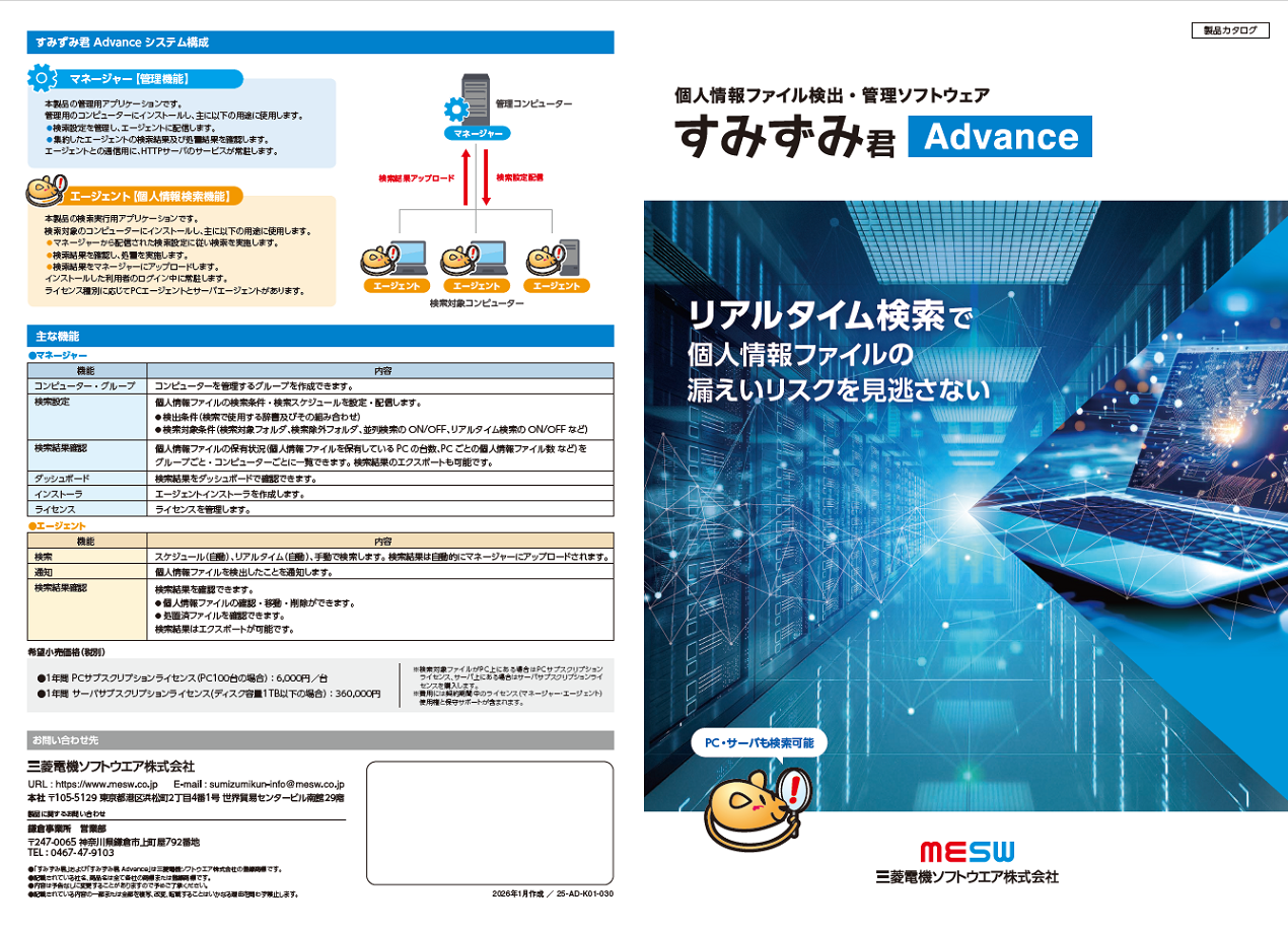個人情報ファイル検出・管理ソフトウェア「すみずみ君 Advance」の製品カタログです。本カタログでは、個人情報ファイル管理のお悩みを解決する「すみずみ君 Advance」の特長・機能や、システム構成などを紹介しています。